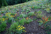 The trail is well-graded with numerous switchbacks, passing by numerous different types of trees. At the sixth switchback you will catch your first glimpse of the wildflower meadows... keep going and your patience shall be amply rewarded! After several more switchbacks, you will find yourself in open meadows littered with penstemon, larkspur, paintbrush, stonecrop. Cone Peak will be directly ahead of you, with Iron Mountain to the west (left) and Echo Mountain to the right.
